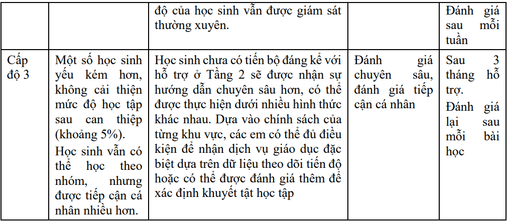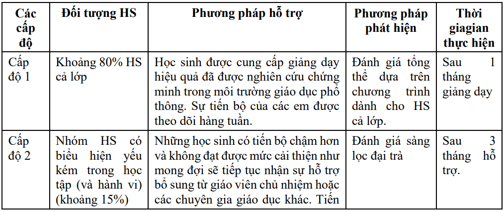 Bảng 1. Các cấp độ trong Mô hình Đáp ứng can thiệp (RtI)