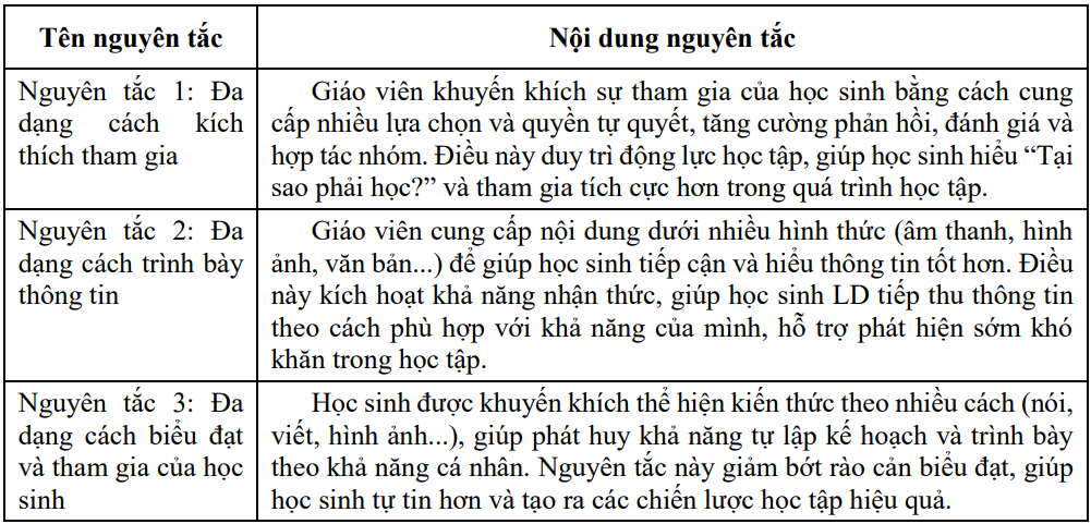 Bảng 2. Các nguyên tắc của Thiết kế học tập phổ dụng (UDL) [14]