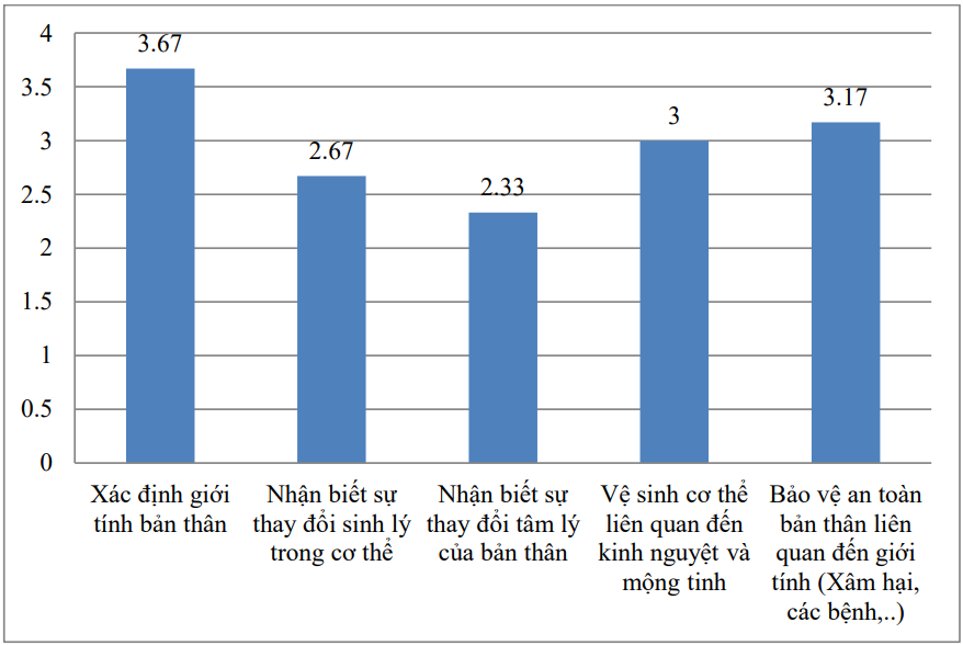 Như vậy nhìn vào biểu đồ trên thì cho thấy rằng các GV đã thực hiện ở mức độ từ thỉnh thoảng đến rất thường xuyên với điểm trung bình M=2,33 đến 3,67. Trong đó nội dung được thực hiện thường xuyên nhất là “Xác định giới tính của bản thân” với M= 3,67; nội dung thỉnh thoảng được thực hiện là “Nhận biết sự thay đổi tâm lí của bản thân” M=2,33 và “Nhận biết sự thay đổi sinh lí của bản thân” khi đến tuổi dậy thì với M=2,67.